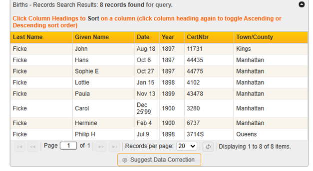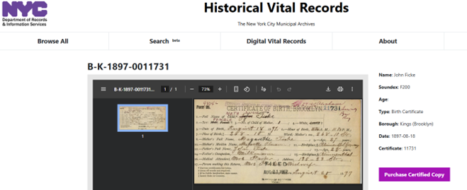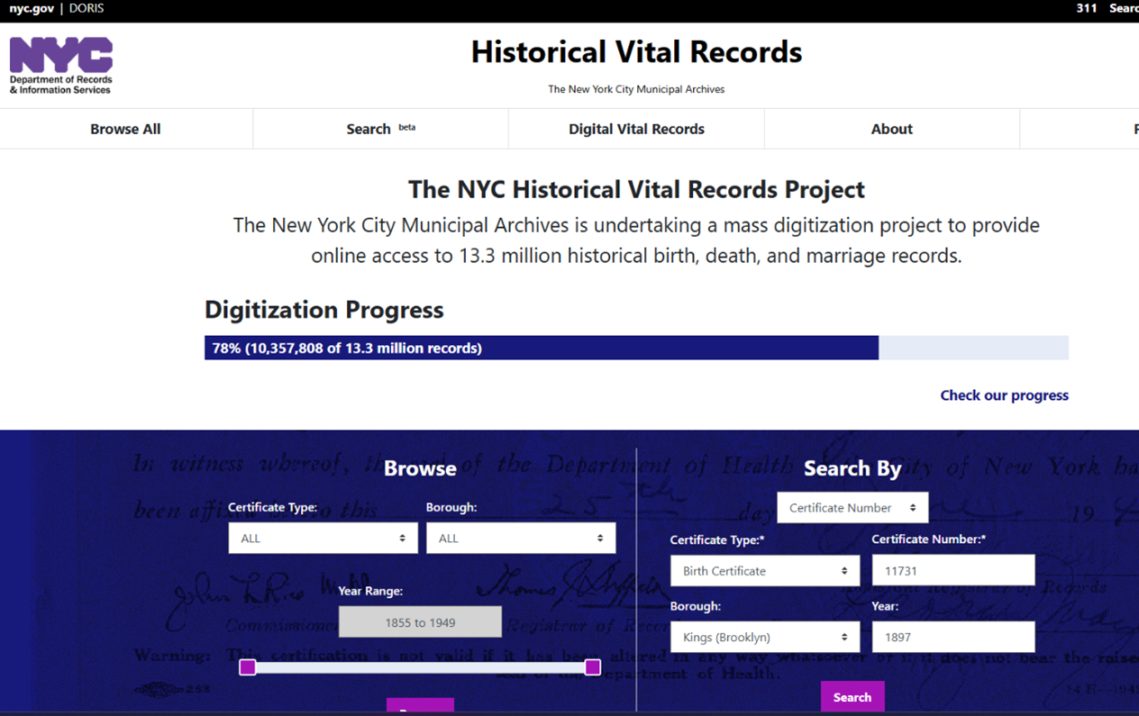 5. I want the top name, with certificate number 11731. So, I go the NYC Municipal Archives page at https://a860-historicalvitalrecords.nyc.gov/