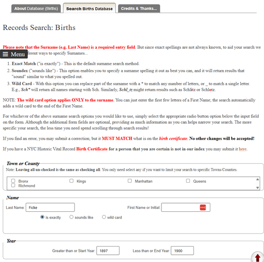 3. Once you have opened the page you have selected, click on Search ___ Database and fill in any known information. These databases all allow for a “sounds like” and “wild card” searches, which the NYC Municipal Archives page does not. This is why you want to use the GGG databases to get certificate numbers. Otherwise, you would need to know exactly how the transcriber wrote out the transcription for the NYC Municipal Archives page. Just think about it this way….the transcriber thinks the first name says Roy but is actually Ray. You look for Ray and will never find it since it is inputted at Roy.
